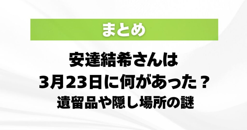 安達結希さんの事件は、父親の逮捕で大きく動きました。 いま気になっているのは、3月23日に何があったのか、遺留品がなぜ別々に見つかったのか、そして遺体はどこに隠されていたのか、このあたりではないでしょうか。 父親は死体遺棄容疑で逮捕され、その... -